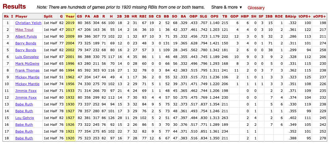 8. Christian Yelich is batting .329 with an ISO of .378 in the first half of the season; that’s something that has only happened 17 other times in MLB history. Check it out, per the Play Index at Baseball Reference: