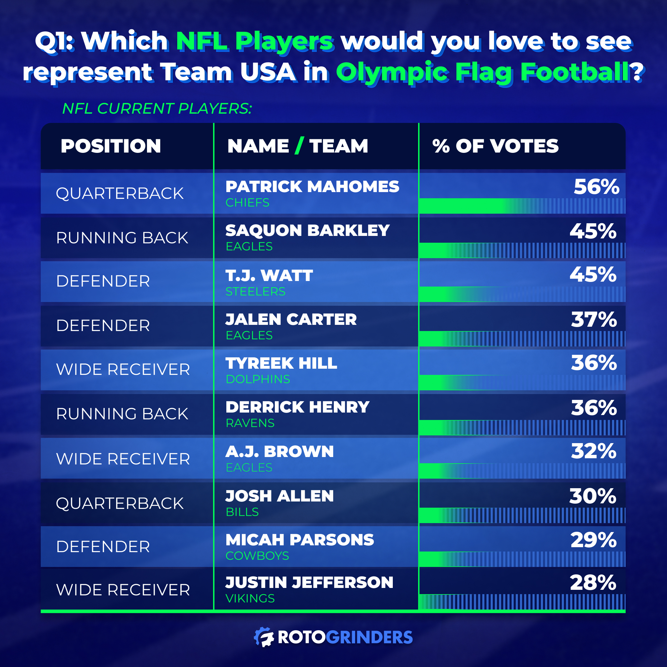 This survey was commissioned by RotoGrinders and conducted online between June 6th and June 9th, 2025, sampling 1,001 dedicated NFL fans across the United States. Participants selected their top picks from current NFL rosters, rising stars from the 2025 draft class who are expected to be in their professional prime by the time of the 2028 Olympics, and legendary players from the past. The results capture fan excitement and anticipation for the upcoming Olympic Flag Football competition.