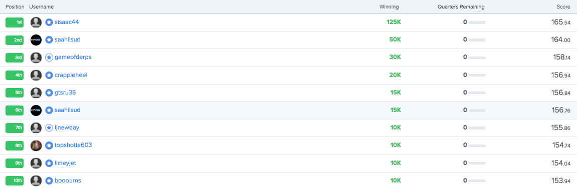 sissaac’s winning lineup included Matthew Stafford and Golden Tate of the Lions, who combined for over 48 points. He also rostered the highest-owned running back and tight end in this contest. David Johnson produced 34 fantasy points and outscored Le’Veon Bell by 14.8 points, despite Bell costing $100 more.