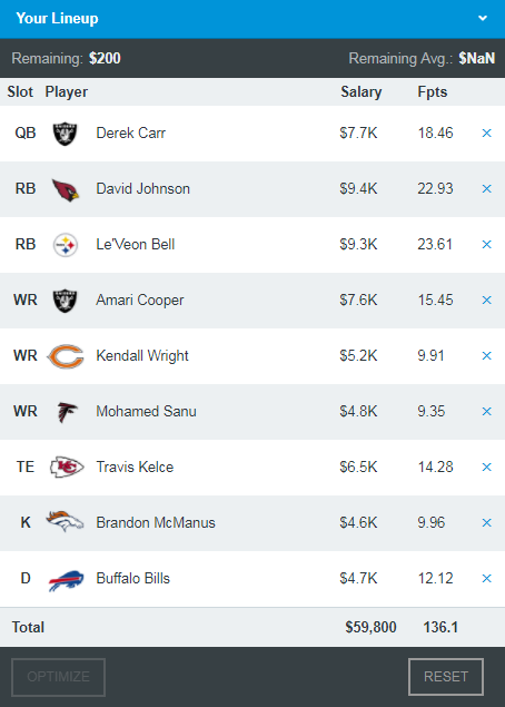 Click the OPTIMIZE button and you’ll get the optimal projected lineup (the default is RotoGrinders projections) for that Raiders stack.