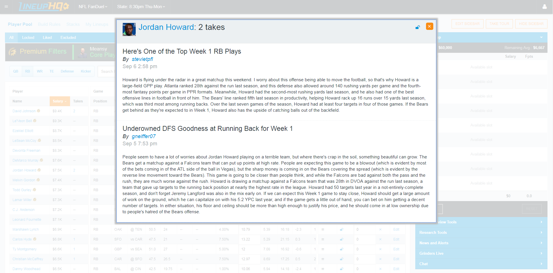 Now you’ll be able to build lineups while seeing advanced stats from great resources like Football Outsiders and Player Profiler, while also getting expert insight from the likes of Notorious, stlcardinals84, meansy53, and JMToWin. Let’s go through some of the great features of LineupHQ and build some winning lineups!