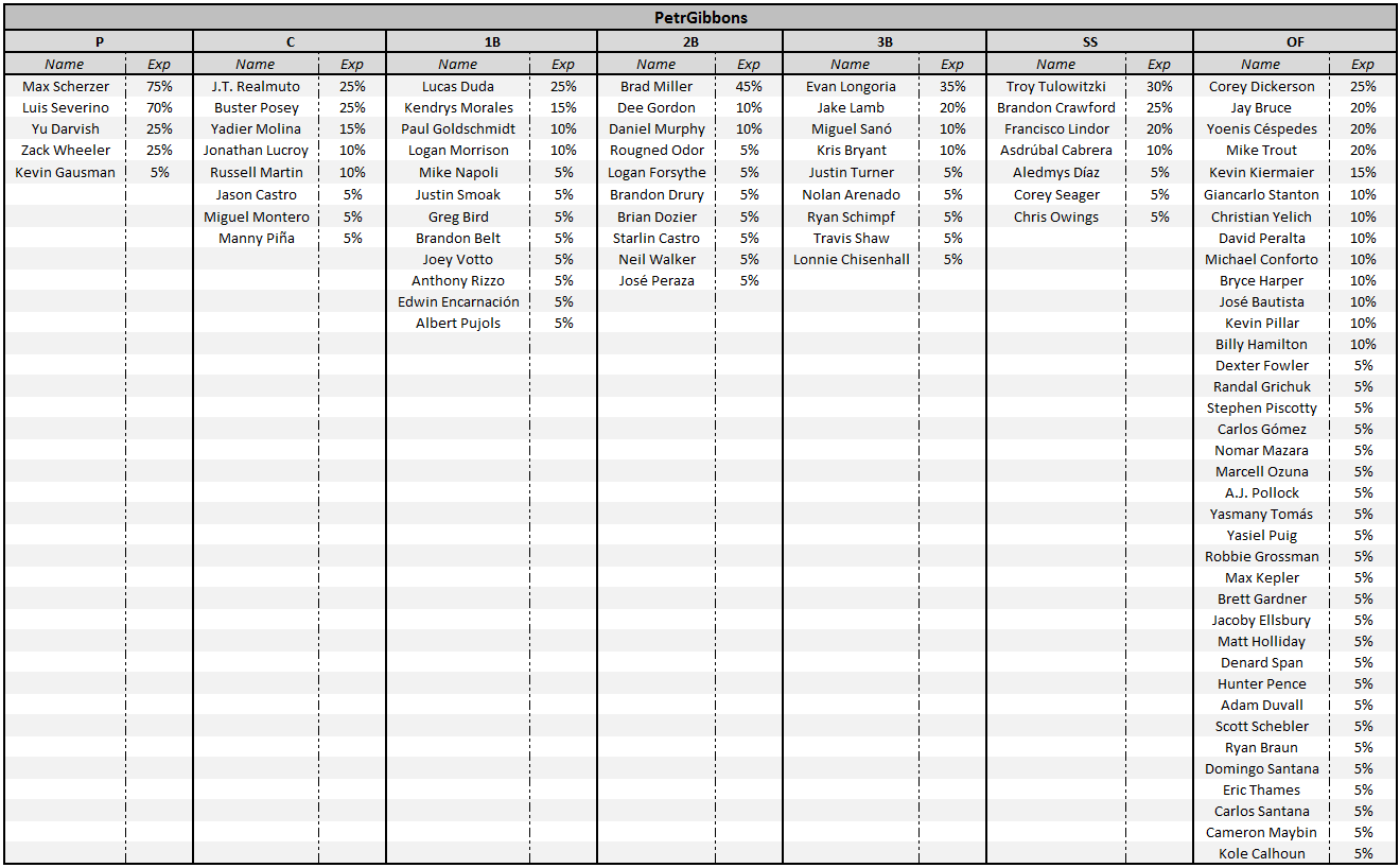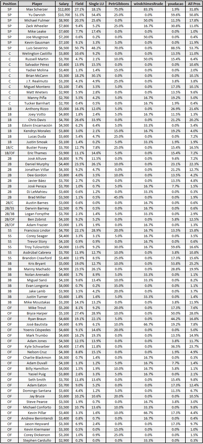 As expected, PetrGibbons followed the trend of picking the high-upside, high-K-rate pitchers to round out his pitching ownership. As some might avoid Scherzer due to his high salary, Petr avoided some of the most expensive stacks on the slate (Orioles, Cubs) and could afford to slot him in safely. Pairing Scherzer/Yu with a healthy amount of Luis Severino saved a good chunk of salary and allowed him to still see a good amount of ownership between middle projected game totals on the night (Indians, Marlins, Mets, Giants, Rays, Blue Jays). With strategy, Petr definitely had a wide range of point totals, from a 20th place 158.95 to a 1663th place 58.65. However these bets paid off as he put another two lineups inside the top-50 and cleared the GPP average 21.4% cash rate by 14% (35% cash rate); 20 total lineups.