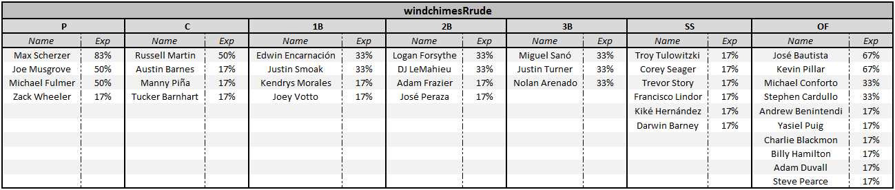 Windchimesrrude on the other hand faded Severino completely and went with another strikeout-heavy pitcher in Michael Fulmer (even matchup against Tampa Bay). The slumping Joe Musgrove wasn’t able to pick up much steam either against the Angels as he allowed five earned runs in five innings (five strikeouts). Even with the underwhelming performance by Musgrove, chimes was able to ride his Cincinnati Reds stack to an 11th place finish as Votto and Duvall each hit one out of the park. Chimes cashed on five of his six lineups as he hit on Rockies, Reds, and Blue Jays stacks.