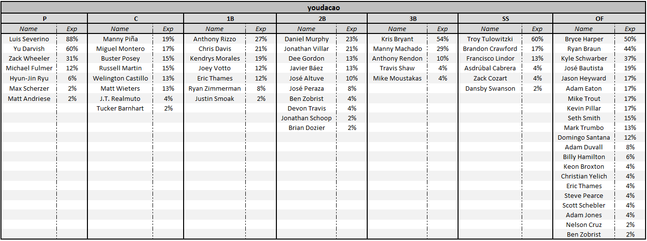 Youdacao nearly had a full fade on Scherzer as he just included him on one of his 52 lineups. It didn’t hurt him as Max had an average 26.75 point night, good for 2.09x pts/k$. What did hurt him however, was Yu Darvish giving up four earned runs in five and a third innings, while just striking out four batters (60% ownership). What was even more impressive was that despite the poor Darvish outing, youdacao’s top four lineups used him and he still placed 5th, 7th, 9th, and 30th for a nice payday. Similar to chimes, youdacao featured a Cincinnati Reds stack in his top finishes, fielding the 1/2/3/4/8, 1/2/3/4/6, and 2/3/4/5/6 orders respectively.
