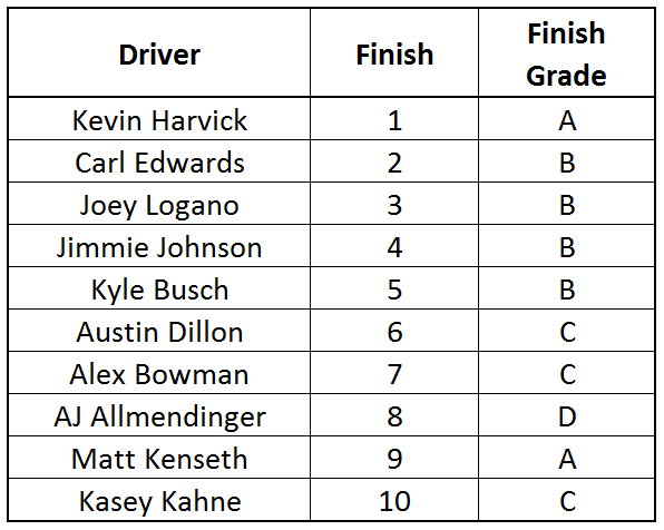 For this race, we gave out three A grades in the finish potential category, which again generally means race winning potential, and for the 2nd week in a row we drew the winner out of those A grades (with the other two finishing in the top 10). There were seven B grades (top 5 potential), with three of them finishing in the top 5, two of them wrecking (Keselowski and Elliott), Truex finishing 11th and Denny Hamlin bouncing back from some car troubles to finish 15th. Rounding out the top 10 was Austin Dillon, riding a 2-tire pit stop late to a solid finish, Alex Bowman and Kasey Kahne continuing a solid stretch for team Hendrick, and our biggest surprise of the day, the previously mentioned AJ Allmendinger taking his D grade and rubbing it in my face. I’d say in terms of grading finish potential, this was our strongest race since the projections went live.