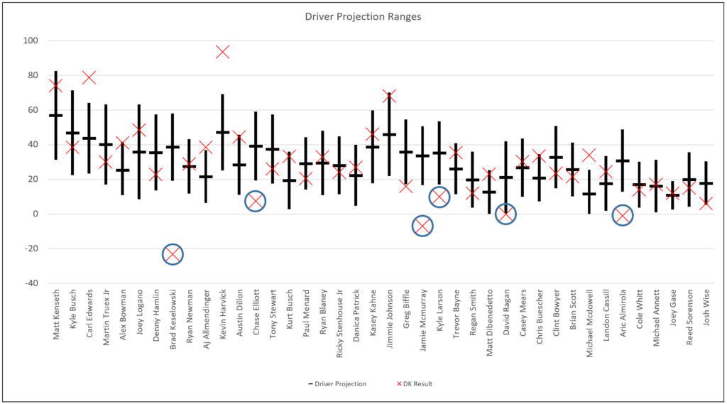 There were a few big names that had some trouble, mainly Brad Keselowski, Kyle Larson, Chase Elliott, Jamie McMurray and Aric Almirola (a popular value play across the industry). Aside from the wrecks, there were a few surprise names that did well. AJ Allmendinger rode the momentum of a late surge to a top ten finish, and Michael McDowell gained 11 spots on the day, finishing 22nd and leading the way for the “punt plays”.