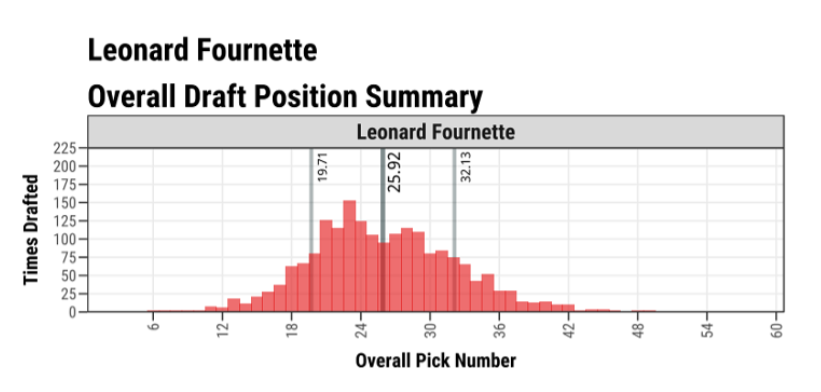 The distribution above encompasses 1906 drafts over the last three months. You’ll notice in the middle of the distribution a vertical line with a large number (25.92) next to it. This is the calculated ADP for JAC RB Leonard Fournette. You immediately notice that nearly half of the 1906 drafts have Fournette going prior to his ADP. The two vertical lines flanking the ADP line represent one standard deviation (SD) in Overall Draft Position. Simply put, if we assume this profile is normally distributed 1, 68% of drafters are selecting Leonard Fournette between picks 20 and 32.