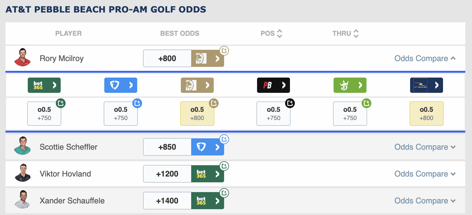 When betting on golf, every edge matters. Rather than scouring sportsbooks for the best odds each week, use the ScoresAndOdds golf page. You can compare odds from all books for each market — outright, top five, top 10, etc. The tool is FREE and can save you time and money.