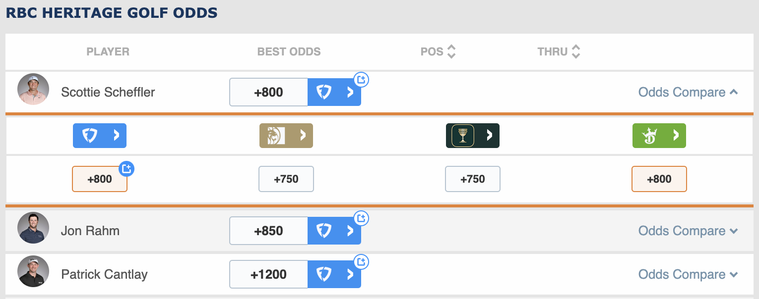 When betting on golf, every edge matters. Rather than scouring sportsbooks for the best odds each week, use the Scores and Odds golf page. You can compare odds from all books for each market — outright, top five, top 10, etc. The tool is FREE and can save you time and money.