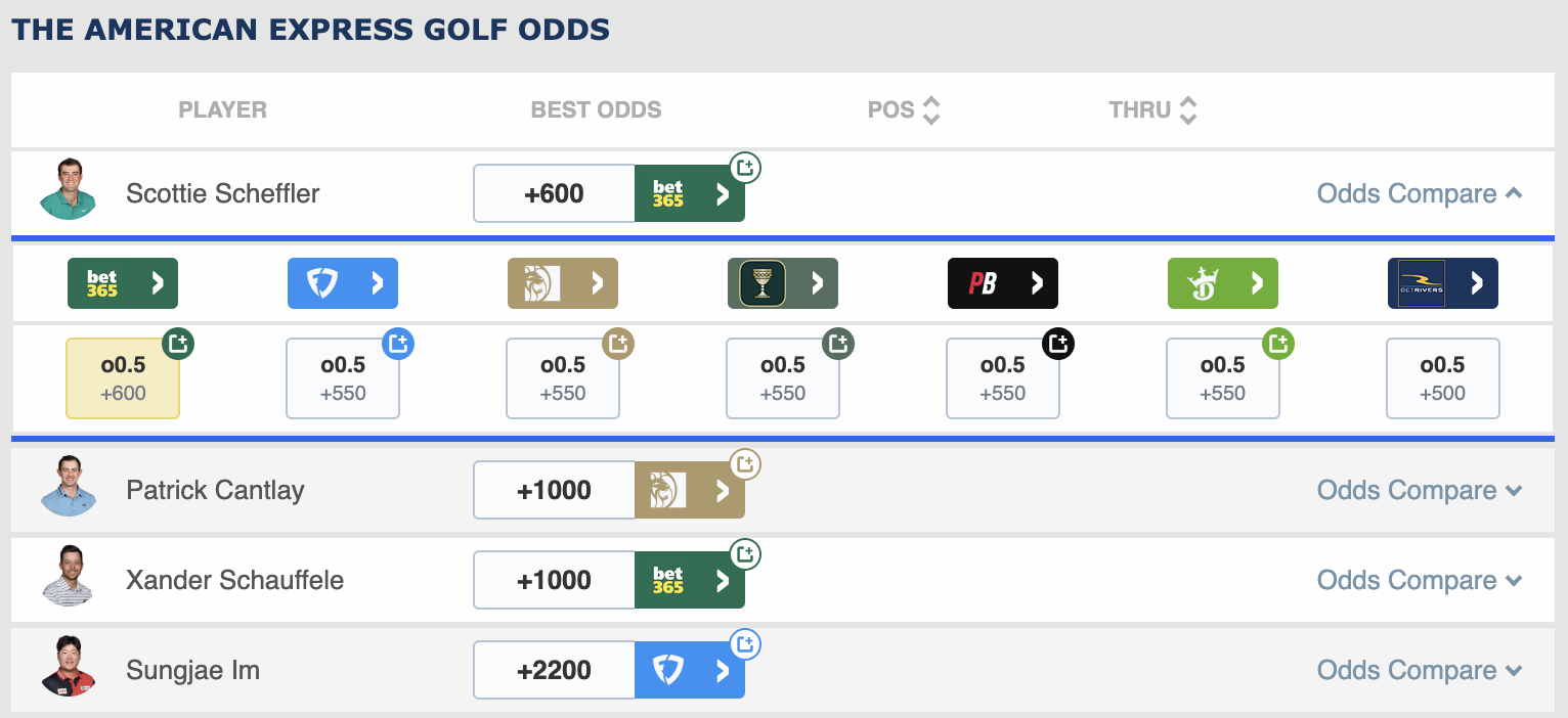 When betting on golf, every edge matters. Rather than scouring sportsbooks for the best odds each week, use the ScoresAndOdds golf page. You can compare odds from all books for each market — outright, top five, top 10, etc. The tool is FREE and can save you time and money.