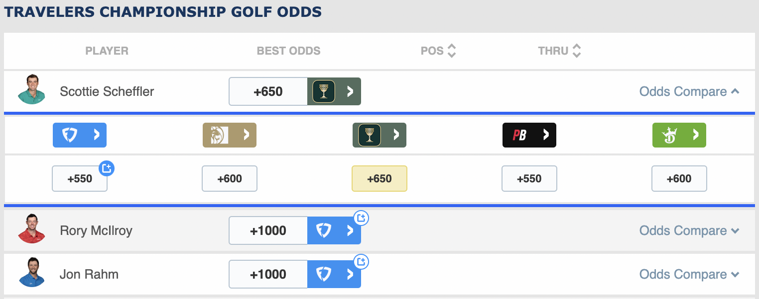 When betting on golf, every edge matters. Rather than scouring sportsbooks for the best odds each week, use the Scores and Odds golf page. You can compare odds from all books for each market — outright, top five, top 10, etc. The tool is FREE and can save you time and money.