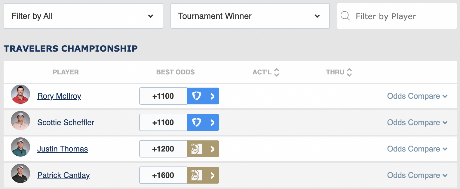 If you are betting on golf, every edge matters. Rather than scouring a bunch of sportsbooks for the best odds each week, check the Scores and Odds golf page. You can compare odds from different books for every market — outright, top five, top 10, top 20, etc. This is a FREE tool that can save you time and money. While you are there, you can sign up for premium access for our favorite bets of the week.