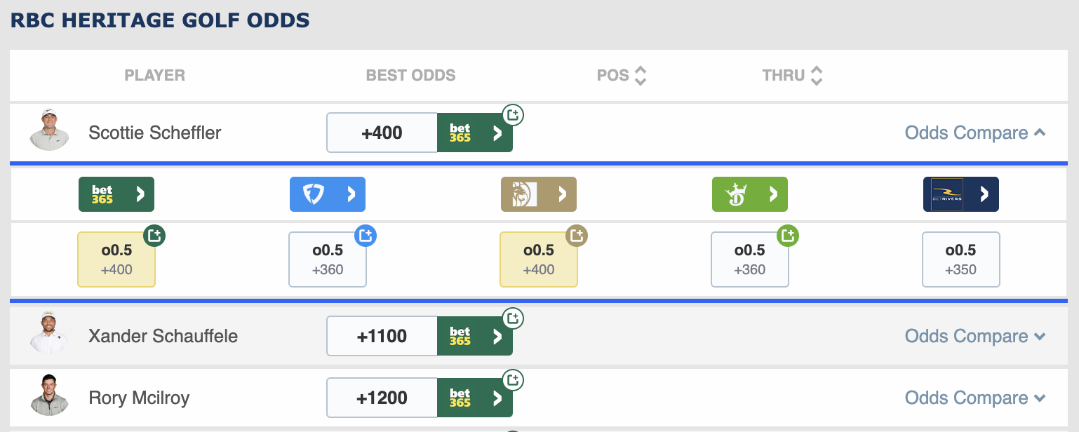 When betting on golf, every edge matters. Rather than scouring sportsbooks for the best odds each week, use the ScoresAndOdds golf page. You can compare odds from all books for each market — outright, top five, top 10, etc. The tool is FREE and can save you time and money.