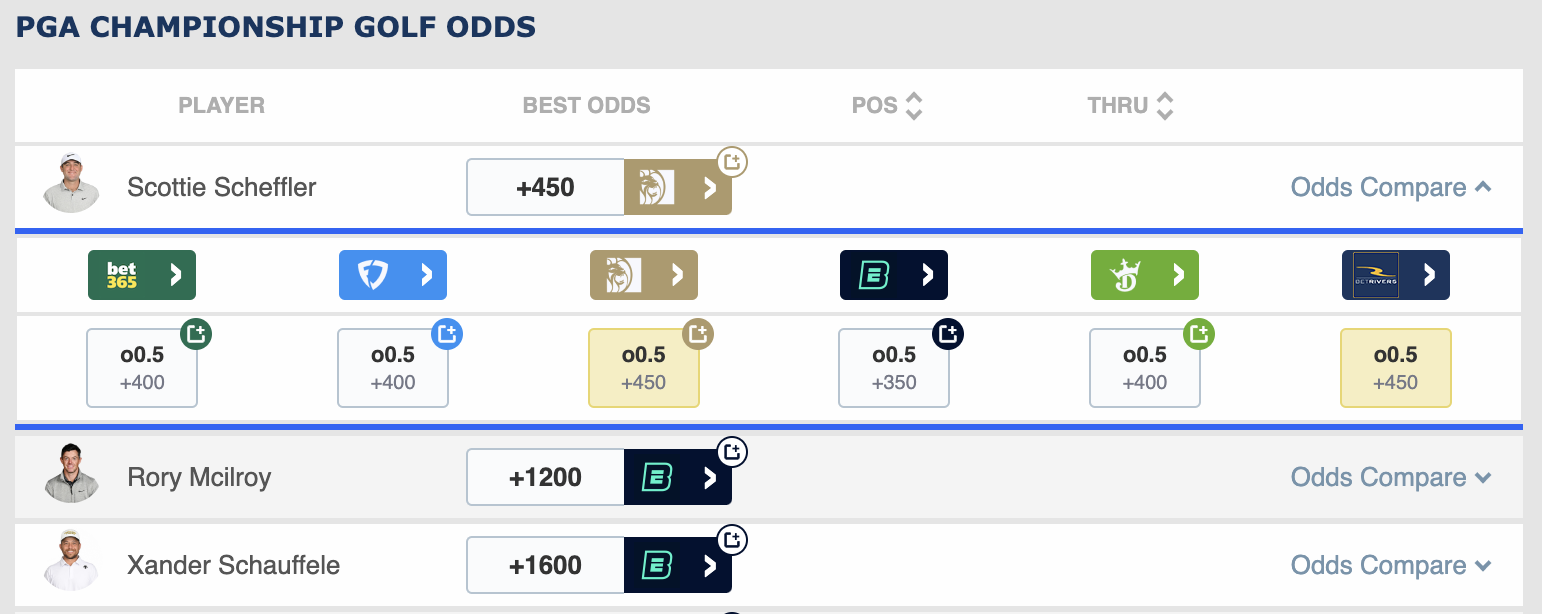 When betting on golf, every edge matters. Rather than scouring sportsbooks for the best odds each week, use the ScoresAndOdds golf page. You can compare odds from all books for each market — outright, top five, top 10, etc. The tool is FREE and can save you time and money.