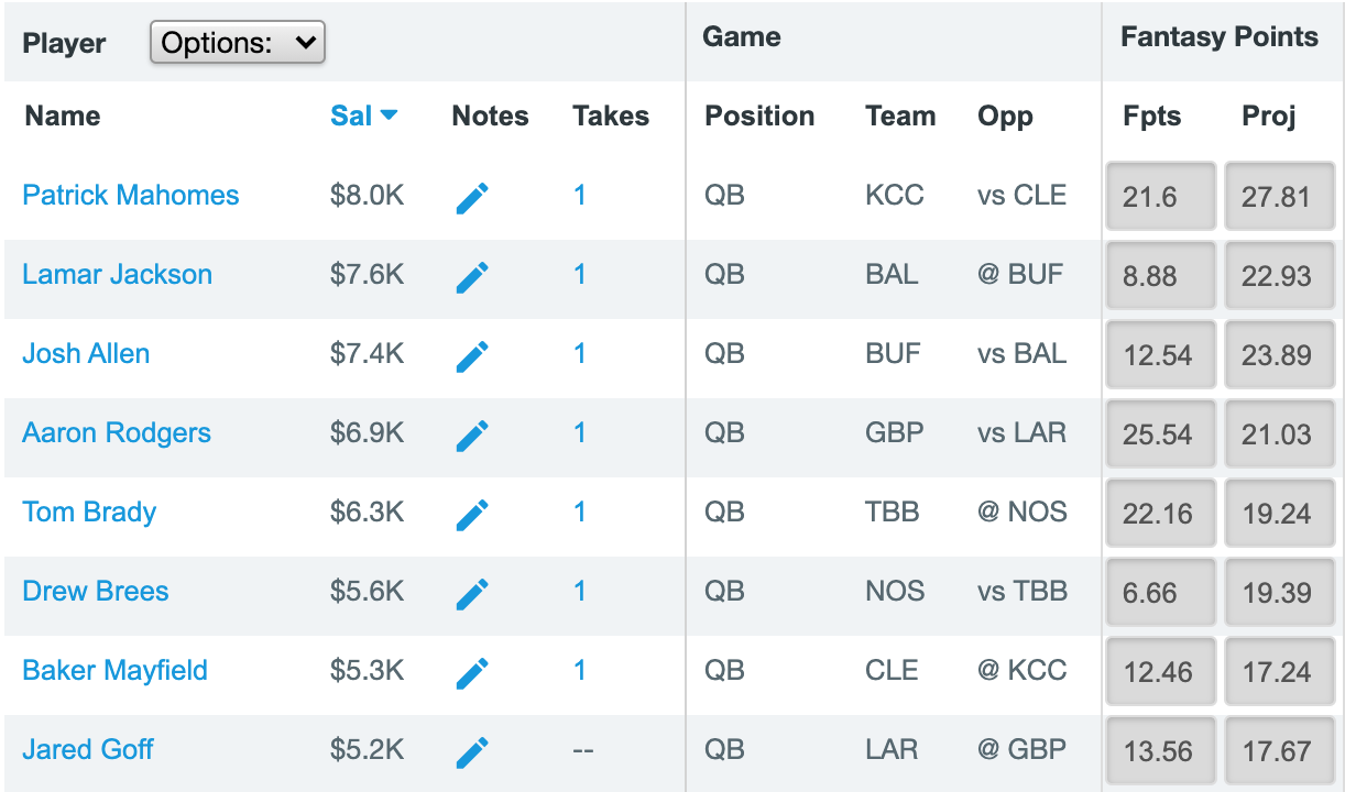 Top Team Total (Full slate): 28.5 – Kansas City Chiefs