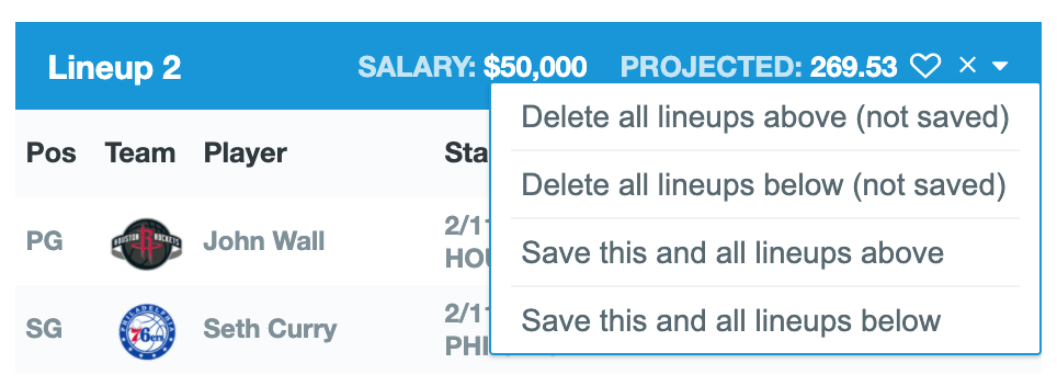 Organizing your lineups in LineupHQ has never been easier. You can delete and save lineups in bulk or individually on the My Lineups page. You can also un-save a set of Saved Lineups, and we recently added the ability for users to name their builds. This should make it easier to manage your lineups and builds as the news changes leading up to lock.