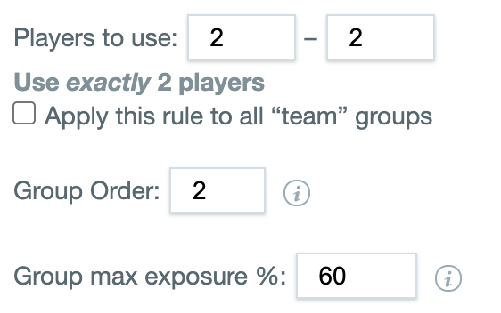 This week, we added the ability to prioritize your player groups and set max exposures for them. For groups with an explicit order set, we apply them to lineups one at a time in increasing order.