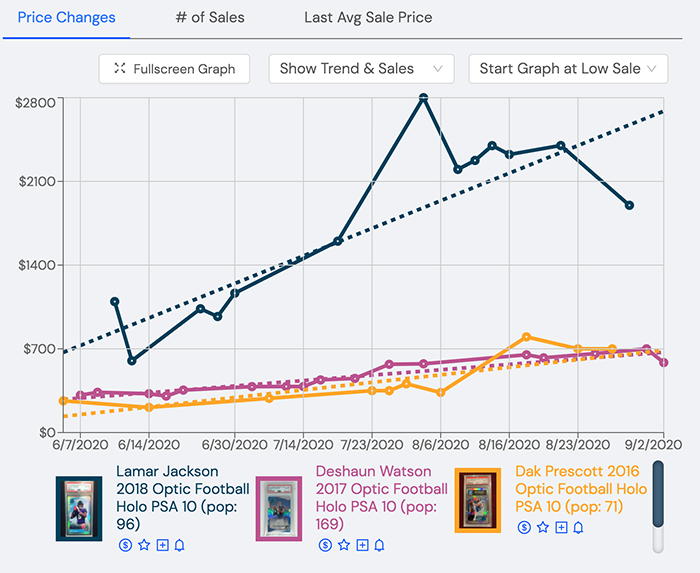 Deshaun Watson – Watson finds himself in a situation that does not necessarily scream “upside”. He lost his best receiver, he doesn’t have the best coaching, and his team has a lousy defense which will make it difficult to win games. But all this means Watson is going to need to put up stats to keep his team competitive, and those stats will get fantasy players excited and generate some buzz for Watson. Watson’s Optic Holo PSA 10 cards have been underperforming relative to Dak Prescott who we’ve used as a comp to Watson in the past. Prescott’s cards recently caught up to Watson in price (about $700 most recently) and I believe the two players have room to run as they target the price of Lamar Jackson’s Optic Holo PSA 10 cards most recently selling for $1,900. While Jackson had an outstanding year last year, Dak and Watson have strung together several great seasons each and there is a lot of ground to make up to catch Lamar’s current value. I could see them each easily doubling during the season and recently bought Deshaun Watson’s card. Don’t sleep on their Prizm cards either.